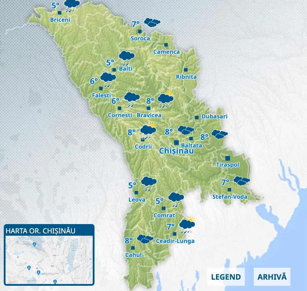 Serviciul Hidrometeorologic de Stat (SHS) anunță prognoza meteo pentru intervalul 11 martie, ora 20:00 - 12 martie, ora 20:00.