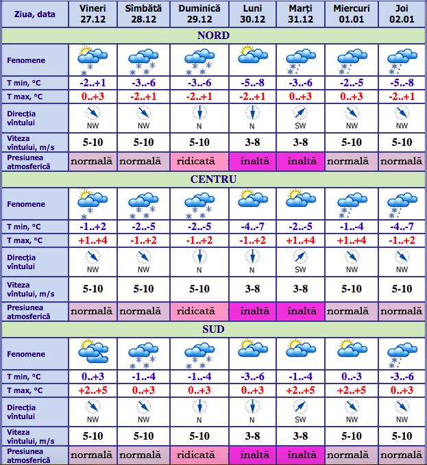 Solicitat de IPN, Ghenadii Roșca, șeful Centrului Prognoze Meteo din cadrul Serviciului Hidrometeorologic de Stat, a spus că izolat va ninge pe 27, 28 și 29 decembrie. Din cauza temperaturilor scăzute care se așteaptă în orele nocturne, pe drumuri ar putea să se formeze polei.
