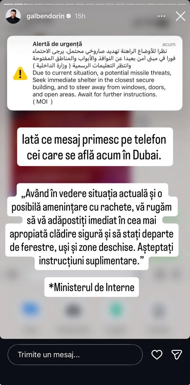 Ulterior, aceasta a publicat și o imagine în care apar mesajele de alertă primite de persoanele aflate în Dubai.