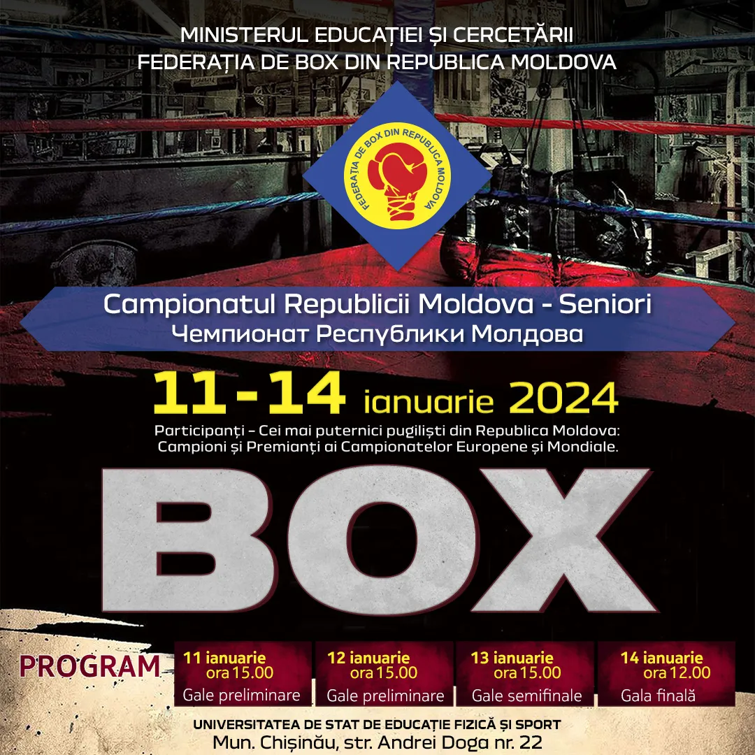 Programul campionatului: - 11, 12 și 13 ianuarie, cu începere de la ora 15.00; - 14 ianuarie finala la ora 12.00. Campionatul Național este organizat de Federația de Box împreună cu Ministerul Educației și Cercetării al Republicii Moldova.