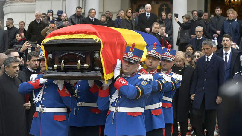 La sosire, sicriul fostului selecționer acoperit cu drapelul României a fost întâmpinat de fanfara Jandarmeriei Române.